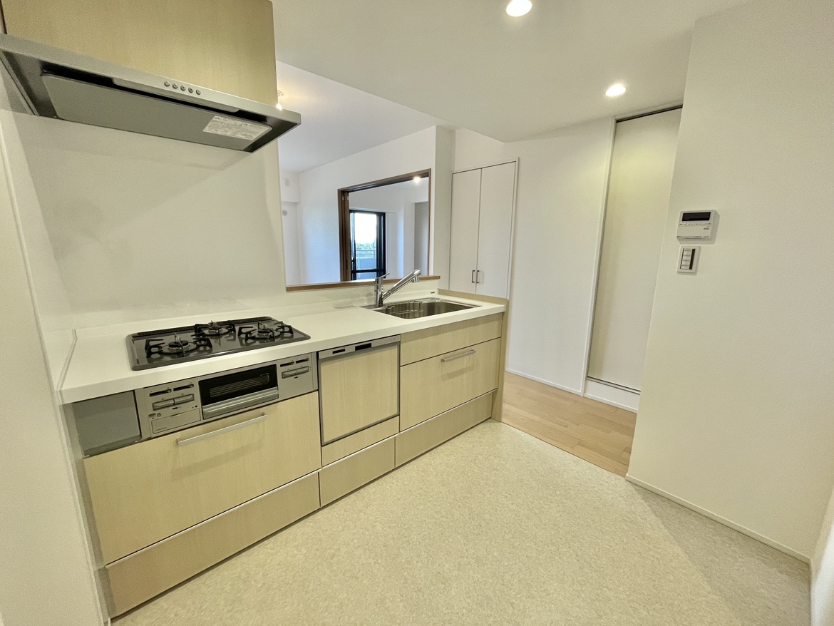 洋室入口を2枚片引き戸、キッチン吊戸棚をなくし壁を撤去したことで